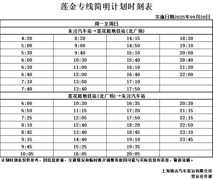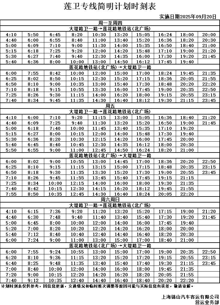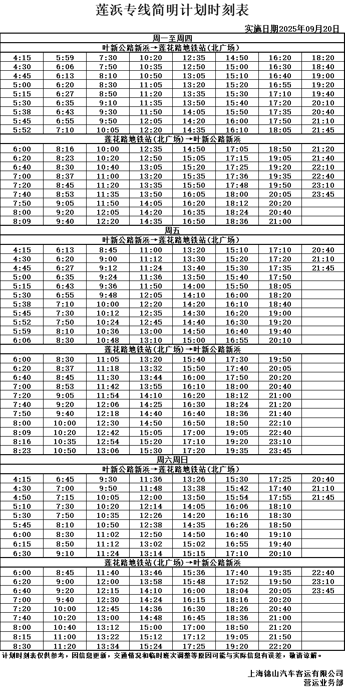 为响应市民出行需求,提升公交服务效能,自2025年9月20日(星期六)首班车起,莲浜专线、莲金专线、莲卫专线首末班车时间有所调整,线路时刻表同步优化,请广大市民朋友提前规划您的出行安排,具体情况如下: