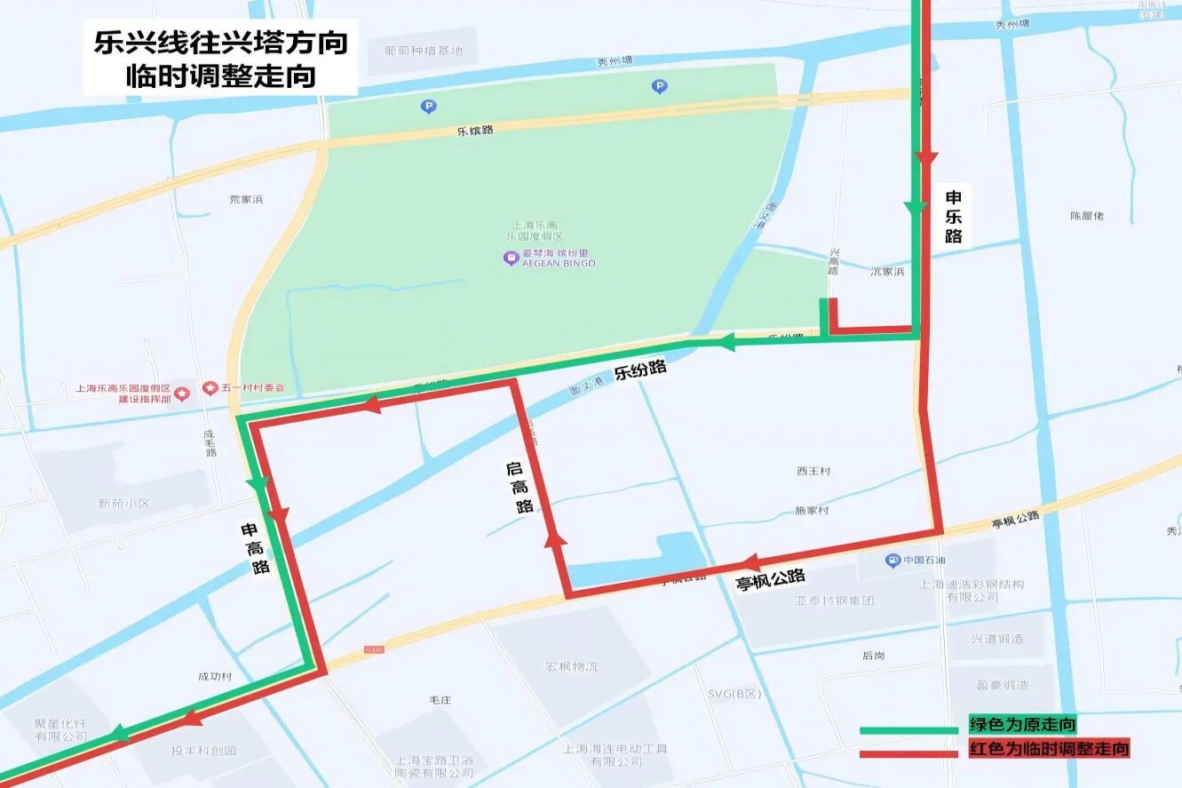 为确保2025上海旅游节花车巡展金山专场顺利进行,自2025年9月21日(星期日)14:30-22:30期间,乐兴线(往兴塔方向)临时调整走向,本次临时调整仅走向变化,对途径站点均无影响,具体情况如下: