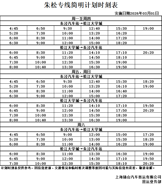 为了进一步提升市民往返金山与松江之间的跨区通勤便利性,切实满足沿线市民日益增长的出行需求,自2026年3月1日(周日)首班车起,朱松专线线路增能,具体情况如下: